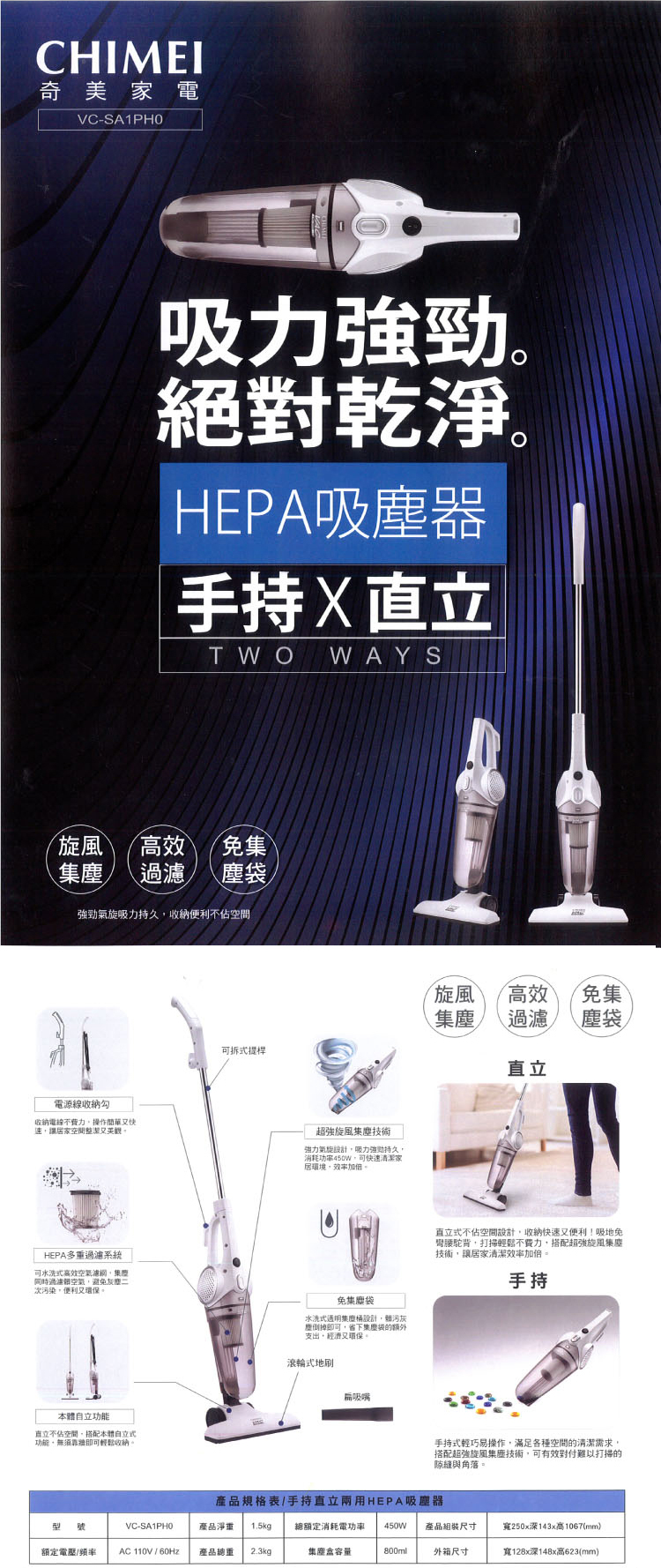 | 還有去各大拍賣網站RUTEN露天、YAHOO拍賣收集商品資料!IGNATIVS是我的好朋友,為人正直又有愛心;IGNATIVS他只會推荐好東西!售價隨時會調整;特價有時效性,有需要的人動作要快!CHIMEI奇美 手持直立兩用HEPA吸塵器 VC-SA1PH0 數量有限,售完為止!限量是殘酷的,不要猶豫入手要快~CHIMEI奇美 手持直立兩用HEPA吸塵器 VC-SA1PH0等好久終於開賣了超讚的啦! | | 詳細商品說明 | ※其他推薦※